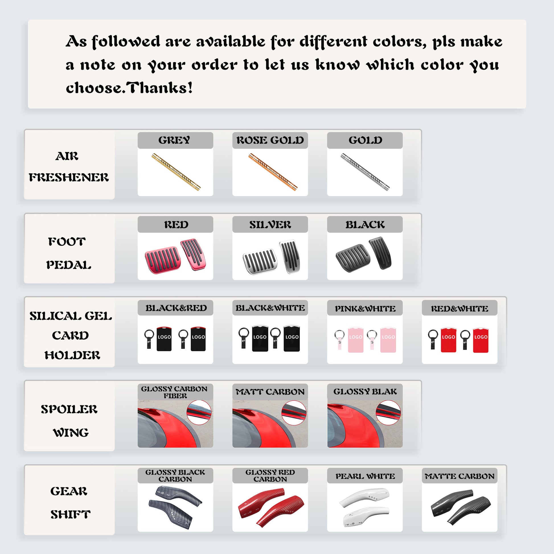- Juego de 16 piezas de alta gama: Incluye protector de pantalla, compartimento de almacenamiento para controles centrales, portavasos de gel de sílice, ambientador, pedales, soporte para teléfono, bolsas de basura para asientos traseros, tarjetero de fibra de carbono o flocado, cronómetro, alerón, palanca de cambios con ABS, molduras para faros antiniebla y alfombrillas. Incluye una almohadilla protectora para carga inalámbrica, un juego de fundas de fibra de carbono para las manijas de las puertas y un compartimento de almacenamiento para el maletero trasero.