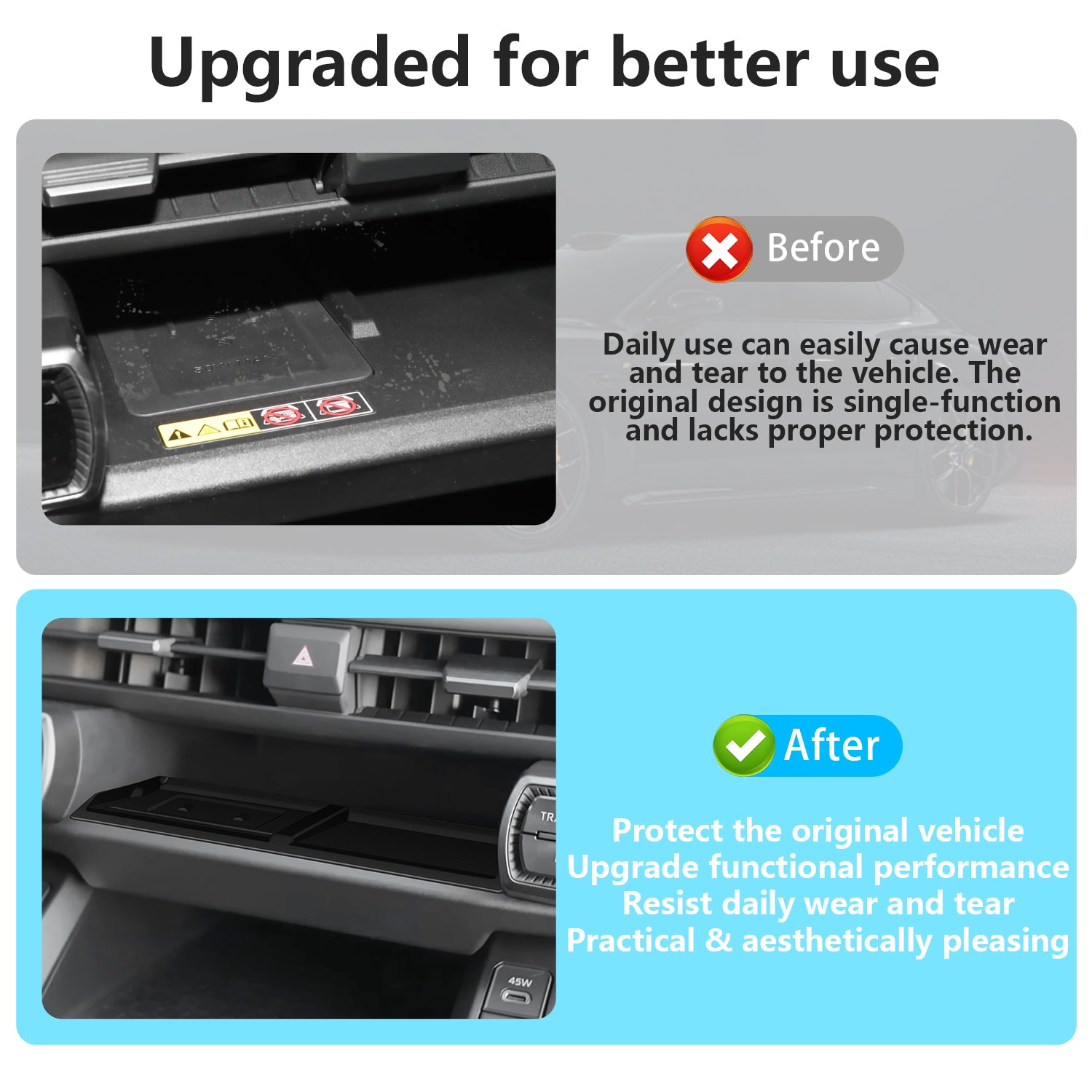 - Full Protection: The shift lever tray features a wrapped edge design, providing full protection for your center console storage box. This makes the product easy to clean.